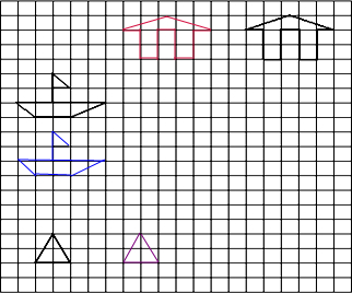 红色房子是小房子向左平移7格后的图形;蓝色的小船是小船向下平移4格后的图形;紫色三角形是三角形向右平移5格后的图形.