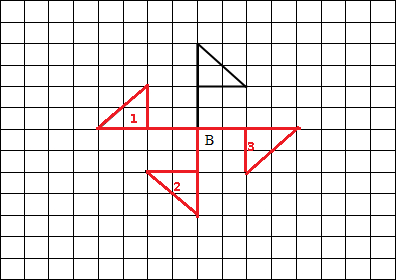解答:解:先把旗子的旗杆绕点B逆时针分别旋转90°,180°,270°后,再根据旗面的特点,画出三角形旗面,即可分别得出旋转后的图形1,2,3.如图所示: