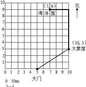 答:大象馆位于( 10,3),在大门的东偏北约300m处.