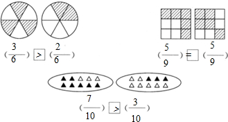 分析:根据分数的意义:把一个整体平均分成几份,每份就是几分之一,由涂色的份数写出分数,再根据涂色部分的大小进行比较大小.