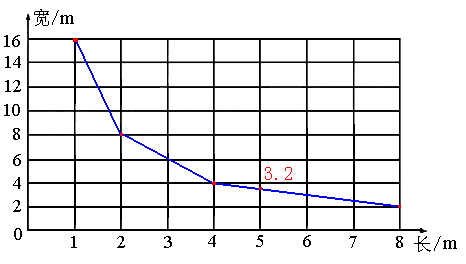 在下图中描出表示长和相应宽的点,然后把它们按顺序连起来,观察图形的特点,并利用图像估计如果长5m,宽大约是多少?![]()
