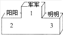 所以前三名运动员的名字为:军军、阳阳、明明.