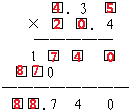 分析:先看做整数乘法来分析,不难发现,下面因数的第二位上是0,根据题干中积的末尾的三位数字可得:第一次乘得的积的是1740,则上面因数是435,又因为第三次乘得的积是三位数,且末尾是0,所以下面因数的最高位是偶数,只能是2,即本题是4.35×20.4=88.740.