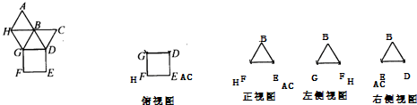 根据展开图,可以看出此椎体是一个四棱锥,底面是正方形EFDG,顶点时B,还原椎体,H和F,A、C和E重合;三视图如下图所示.
