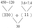 故答案为:12×(25+55),(450-120)÷(3.6+7.4).