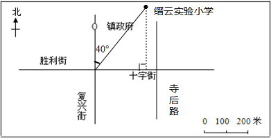 (2)实际距离和比例尺已知,依据“图上距离1厘米表示实际距离100米”即可求出缙云实验小学到十字街的图上距离,再据“缙云实验小学在东北边,与正北成40°夹角”即可在图上画出“缙云实验小学”的位置.