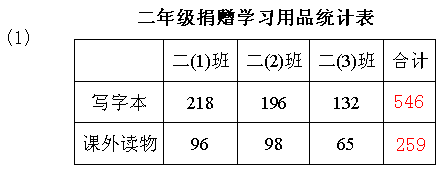 在“抗震救灾”募捐活动中,二年级同学为灾区儿童捐赠了学习用品,具体情况见下表.