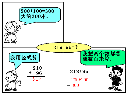 (3)196接近200,98接近100,所以,二(2)班大约捐赠:200+100=300(本) |