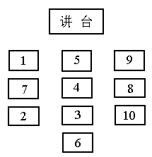 第一行: 1号、5号、9号;第二行:7号、4号、8号;第三行:2号、3号、10号;第四行:6号.如果有视力不好的同学应照顾调整到前面.