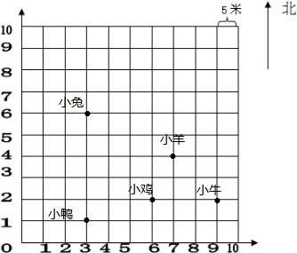 小牛在小鸡的东面15米处,小鸭在小兔的南面25米处.