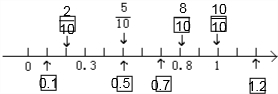 在数轴上面的方框里填入适当的分数,在数轴下面的方框里填入适当的小数.