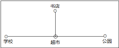 书店在超市正北300米处,公园在超市正东,学校在超市正西450米处,请你在图中上标上比例尺,并用“⊙”标出学校的位置.
