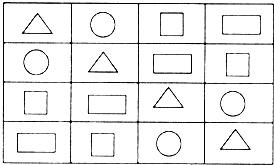 观察图形可知,一条对角线上的图形都是长方形,则另一条对角线上的四个图形都是三角形,又因为每一行每一列都有三角形、圆形,正方形、长方形,据此即可填出另外四个图形.