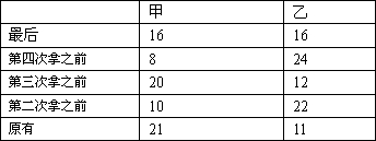 第四次拿之前:甲:16÷2=8(块),乙:32-8=24(块);