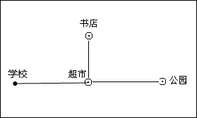 分析:用直尺测量出书店和超市的图上距离为1.5厘米,由此根据比例尺=图上距离:实际距离,求出此题的比例尺,进而求出学校到超市的图上距离,再图中表示出即可.