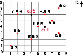 (2)象山的位置是(6,4),在平面图中中标出它的位置如图所示:观察图形可知,它和孔雀园最接近;