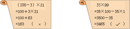 分析:(1)运用乘法分配律简算,即原式=100×21-3×21,进一步计算即可.而原题没有用括号内的数分别于21相乘,故错误.
