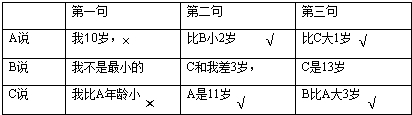 ①假设A说“我10岁”,是错误的,则A说“我比B小2岁”就是正确的;那么C说“B比A大3岁”就是错误的,由此即可得出C说“A是11岁”是正确的,由此即可利用列表的方法展开推理讨论,如果推理得出的结论不出现互相矛盾的情况,则假设成立,反之,则不成立.
