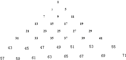 .分析:根据上面数表的数的排列规律,1、3、5、7、9…都是连续奇数,第一行一个数,第二行2个数,第三行3个数,第四行4个数,…第8行有8个数,左起第1个数的规律是1+2=3,3+4=7,7+6=13,13+8=21,21+10=31,按照此规律,第7行的第一个数是31+12=43,第8行的第1个数字是43+14=57,第8行的第6个数应该是57+2×5=67;因此得解.