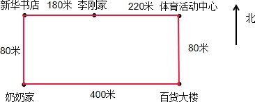李刚从家向西走180米到新华书店去买书,然后向南走80米到奶奶家吃午饭,从奶奶家向东走400米到百货大楼买了一个乒乓球拍,再向北走80米到达体育活动中心打乒乓球,最后向______走______米才能回到家.