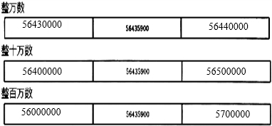与56435900最接近的整万数是56430000和56440000;与56435900最接近的整十万数是56400000和56500000;与56435900最接近的整百万数是56000000和57000000;据此即可.