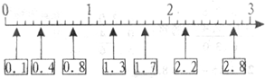 分析:在数轴上把一个单位平均分成10份,每份是0.1,从左到右分别是1个0.1,4个0.1,8个0.1,13个0.1,17个0.1,22个0.1和28个0.1,据此填空即可.