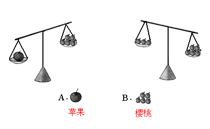 从天平倾斜的情况可以看出,托盘向下的一边的物体较重,托盘翘起较高的一边的物体较轻。 从左面天平看出:1个苹果重,5个樱桃轻;从右面天平看出:5个樱桃重,3个樱桃轻;可以得出:1个苹果比5个樱桃重,5个樱桃又比3个樱桃重;所以1个苹果重,重的选A.