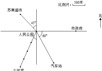 (2)根据图例可知汽车站在人民公园东偏南60°方向,因比例尺是每个单位线段长度是500米,量得汽车站到人民公园是3个单位线段长度,故距离是:
