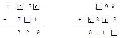 分析:(1)根据差的个位数字是9可得:被减数的个位数字应该是0:10-1=9;被减数的十位数字去掉借位的1后,是6,6-2=4;所以可得减数的十位数字是4,据此可得减数是741,所以被减数是741+329=1070;
