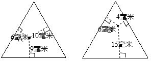 第二个三角形中,点B到三条边的垂线段的长度分别是:6毫米,15毫米,4毫米,长度之和是:6+15+4=25(毫米),