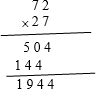 .分析:观察图形可知B×B的乘积的末尾是4,根据乘法口诀可得2×2=4,8×8=64,即B=2或8,若B=2,又因为B×A的乘积的末位数字也是4,根据2的乘法口诀可知A=7,即本题是72×27=1944;(若B=8,可以推得A=3,答案不唯一).