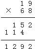 | 58×24= | 840÷7= | 15.9+3.6= | 13,7-5.9= | 19×68= | ▲504÷3= |
