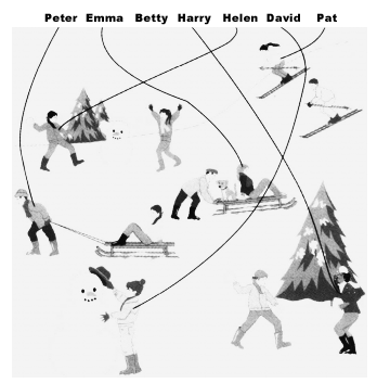 Lines should be drawn between:(在人名与对应的人物之间画线) 1.Emma and the girl on the sledge with a dog(Emma和与狗一起滑雪橇的女孩) 2.David and the boy making a snowman (David和堆雪人的男孩) 3.Pat and the girl skiing (Pat和滑雪的女孩) 4.Peter and the boy pulling the sledge (Peter和拉雪橇的男孩) 5.Helen and the girl throwing snowballs at the snowman (Helen 和同雪人扔雪球的女孩) Example: Boy: I'm looking for Harry. Where is he? Girl: He's standing near the tree. Boy: With snow on his head? Girl: Yes, some snow's just fallen on his head.