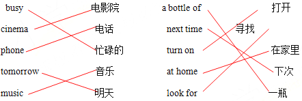 ⑵a bottle of意思是一瓶,常用短语:a bottle of water 一瓶水;next time意思是下次,是表示将来时态的关键词组;turn on意思是打开,常用短语turn on the TV打开电视机;at home意思是在家,home是家的意思,常用的词组还有go home 回家;look for意思是寻找,强调找的动作,近义词是find找到,强调的是找的结果,类似词组:look after 照顾、照料,look at 看。