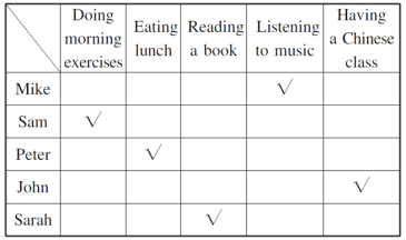 Doing morning exercises | Eating lunch | Reading a book | Listening to music | Having a Chinese class | |